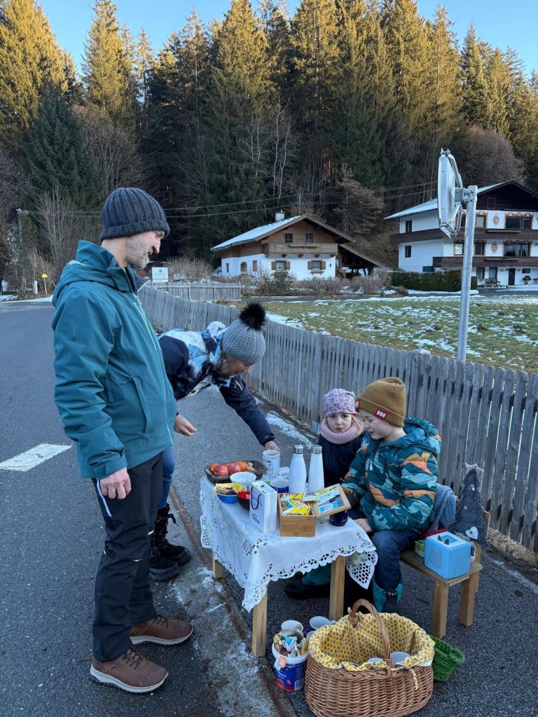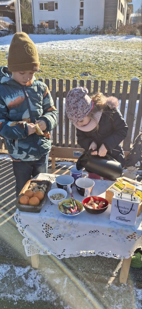 „Möchten Sie eine Tasse Tee?“ hieß es für Spaziergänger am Bichlachweg einige Tage nach Weihnachten. Die Kinder, Hektor und Serafina, wollten unbedingt für die Kinder in Peru Geld sammeln. Sie bauten ihr Maltischchen auf der Straße auf, schleppten eine Kanne mit heißem Wasser, Tassen und Tee herbei und boten sie den vorübergehenden Spaziergängern an. Zwei Stunden lang hielten sie aus, ehe die Kälte sie zum Heimgehen zwang.